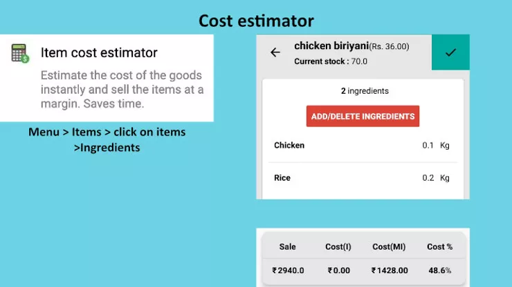 Similarly, there is a cost estimator feature that can help you to automatically calculate the cost of making a product for example how much it takes to make one biriyani. This will allow you to price your product accordingly. This is a very useful tool as many retailers and restaurants can lose money unnecessarily underpricing the product, so with this price estimator tool, this can be avoided.