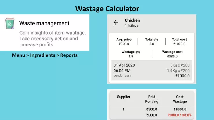 For example, the waste problem is a big deal in running a restaurant. IVEPOS has a feature called wastage calculator. Let say we need 0.1 kg of chicken needed for biriyani and we have 10 kgs of chicken. This should be enough for 100 biriyanis, but you have only 6kgs remaining after selling 10 biriyanis there is a 20% wastage. Now you need to find out what happened to this 2 kgs chicken, is it wasted or stolen?